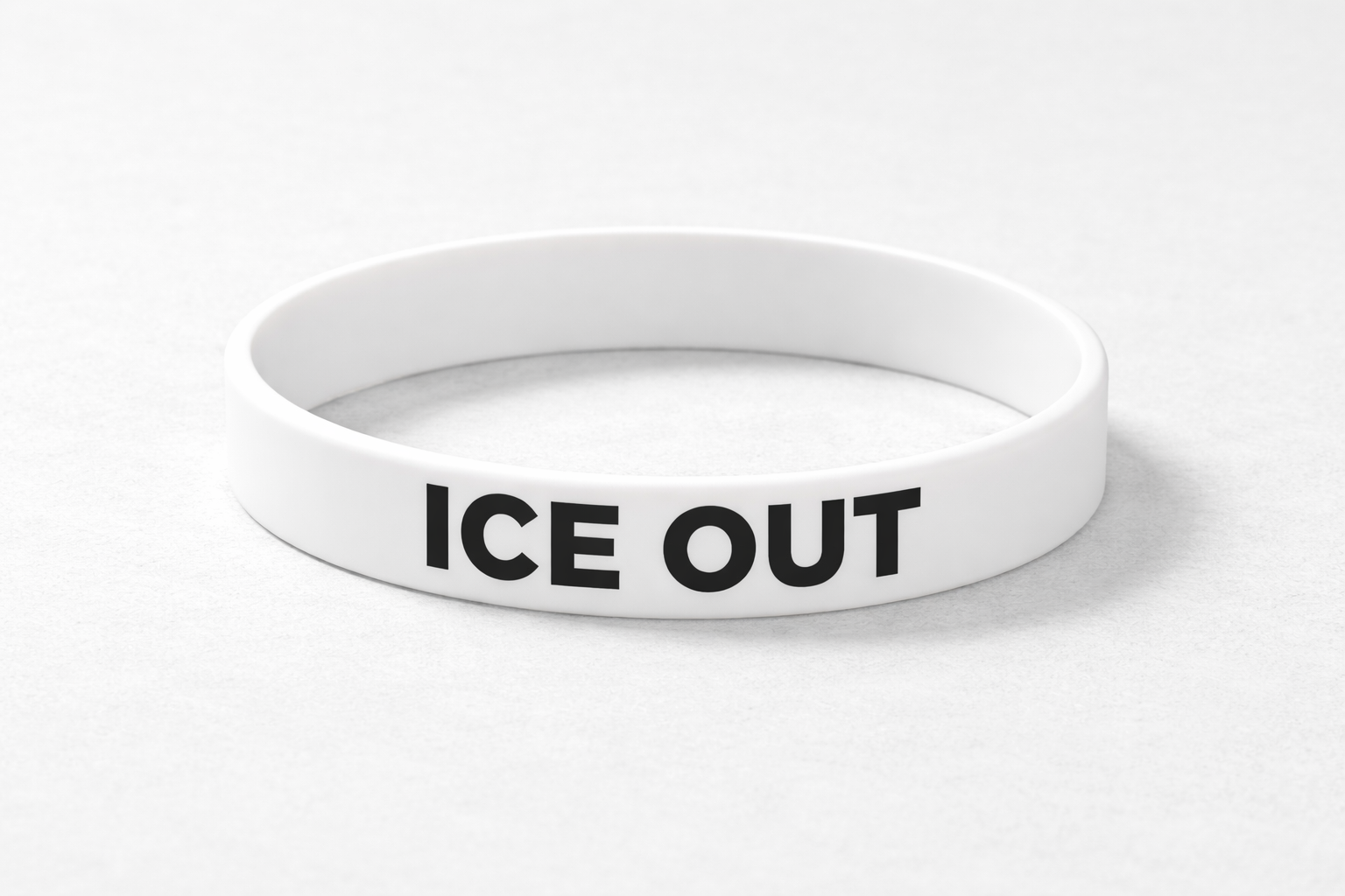 Make a statement with a classic, no-frills design. This white 1/2" silicone bracelet features bold black lettering that reads “ICE OUT”, delivering a strong message in a simple, wearable form.